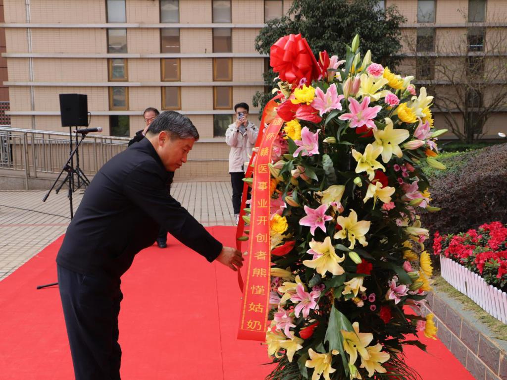 熊盛文代表熊慬亲属及后人向熊慬校长雕像敬献花篮并仔细整理缎带。全体人员向熊慬校长雕像三鞠躬。