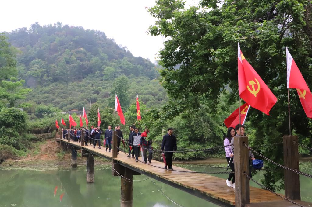 重走一段长征小道。4月10日一早,阴雨绵绵,全体人员在登贤驿站集结,重走“登贤1934”长征小道前段。大家沿着湿滑的山间小道过金沙河、古石桥、初心树、思源井,虽然只有短短的5公里路程,但却让人真切地感受到了红军当年的艰辛。