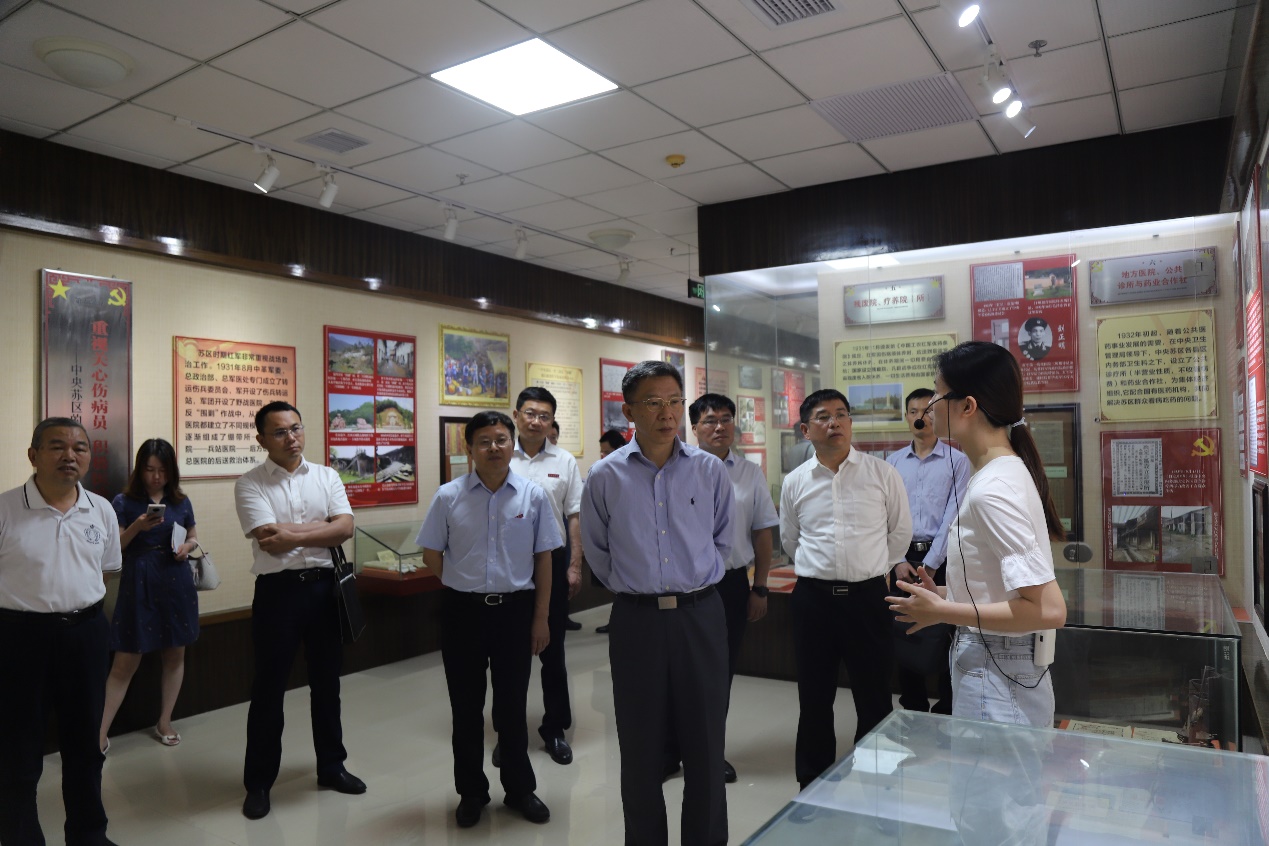 座谈会后,罗小云来到学校红色卫生史博物馆调研,详细了解波澜壮阔的中央苏区红色卫生历史,他饶有兴致地参观,不时驻足观看,并仔细询问图片、文物背后的感人故事。罗小云希望学校进一步做大做强红医品牌,挖掘红医精神,推动红医特色育人,培养德技双馨良才。