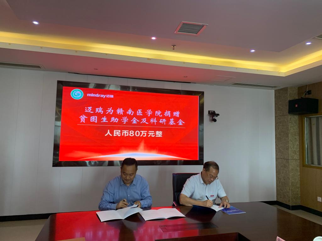 叶军明和迈瑞公司南昌分公司总经理崔江波共同签署捐赠协议。