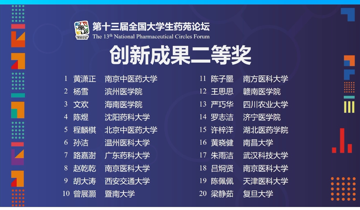 全国大学生药苑论坛被誉为“药学挑战杯”,是国内药学领域高水平的学生竞赛,对激发药学生专业志趣和创新潜能,展示药学科学和药学服务领域的大学生创新创业成果和实践育人成效具有重要意义。此次论坛吸引了清华大学、北京大学、浙江大学、中山大学、中国药科大学等全国110余所高校的近600名师生,共计202项本科生成果及论文参与角逐。赛事通过“线上+线下”模式开展,经过壁报交流、论文评选、学生答辩等环节,共评选出优秀论文奖37项(我校排名第3),创新成果奖特等奖3项,一等奖21项,二等奖37项,三等奖56项。