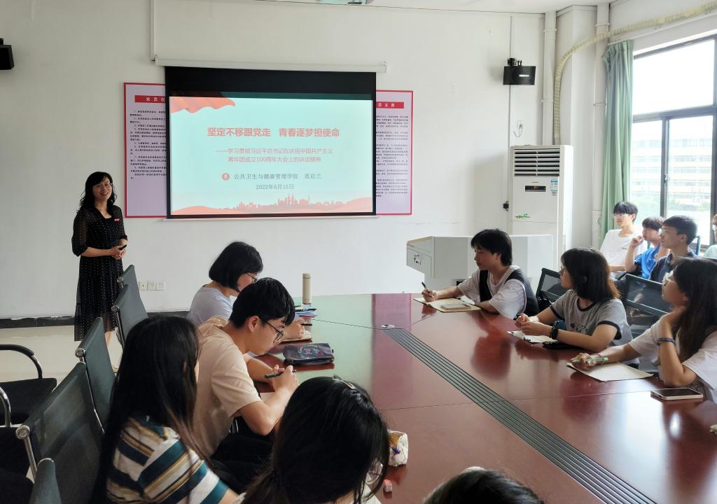 6月15日,公共卫生与健康管理学院党委书记范启兰以《坚定不移跟党走、青春筑梦担使命》为题,给2020级预防医学专业本科1班全体同学上了一堂专题思政课。