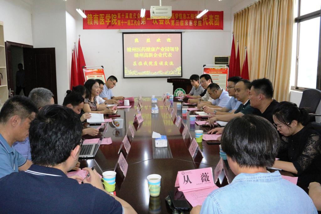 6月15日,章贡高新区管委会副主任潘小军携赣州医药健康产业园负责人刘铭昊、殷爱荣以及赣州医疗设备生产企业代表到医学信息工程学院洽谈合作。