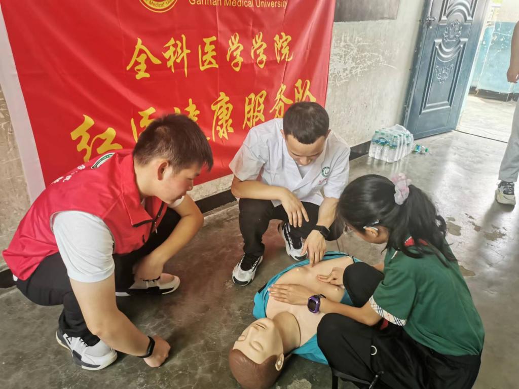 在会昌县西江镇中心小学,大家为小学生进行了常规身体检查,普及了正确的洗手方法,普及讲解心肺复苏、气道异物梗阻处置、溺水、烧(烫)伤、崴脚现场处置等适用的应急救护知识和技能。学生跃跃欲试,受益匪浅。该院党委书记张自翔代表学院向西江镇中心小学捐赠了部分文具与急救包。