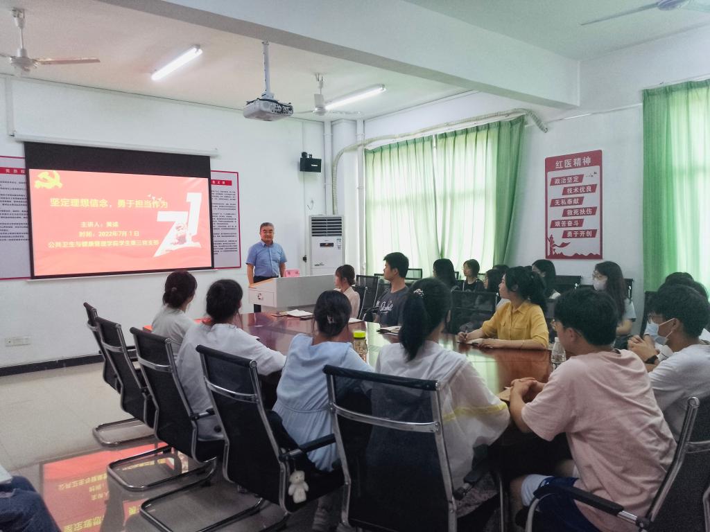7月1日,公共卫生与健康管理学院院长黄诚以“坚定理想信念,勇于担当作为”为主题,给该院学生第三党支部党员、入党积极分子讲授一堂生动而深刻的“七一”专题党课。