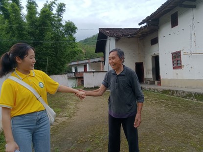 乘着蒙蒙细雨,赣医护理学院志愿服务队来到兴国县西江村。稍加整顿后,志愿者们便跟随驻村服务队的脚步走进村口树荫下或村民家中。量血压、健康体检、推拿等,志愿者们有求必应。面对着语言沟通上的阻碍,志愿者们耐心做出解释;面对着村民情绪上的低落,志愿者们悉心鼓励。“少吃盐、多吃蔬果、适量运动……”志愿者们一遍又一遍的强调。其中一位百岁老奶奶紧紧握住志愿者的手不让其离开。志愿者临走时还极力要求儿媳挽留志愿者在家中吃饭。