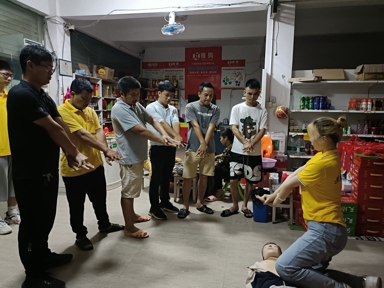 为响应国家“人人学急救”的号召,提升当地村民的急救意识和急救能力,志愿者们为村民普及心肺复苏、海姆立克等急救知识与技能。面对村民满脸疑惑,志愿者们不停的讲解、演示,并邀请村民上手练习。由于年轻人白天忙于农活无闲暇时间参与此次白天的急救知识与技能的学习,志愿者利用晚上的时间,在村口小超市中为他们单独开课,重复讲解,帮助他们熟练掌握急救技能。