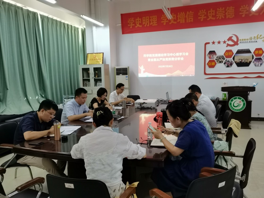 7月26日上午,药学院党委召开中心组理论学习会暨全面从严治党形势分析会,党委书记彭磊主持,学院领导班子成员、各支部书记参加。