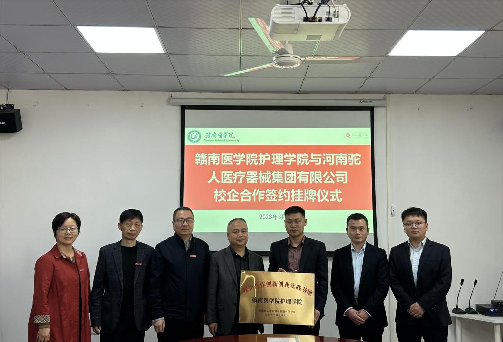 3月8日下午,护理学院与河南驼人医疗器械有限公司校企合作签约挂牌仪式在章贡校区举行。河南驼人医疗器械集团人力资源总监董金锋一行、学校招生与就业管理处处长黄春平、该院领导及教师代表参加仪式。该院副院长孟利敏主持。