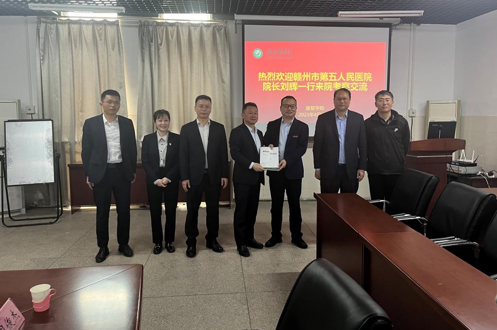 会上,学院院长温优良从学科发展、专业建设、取得的成效等方面详细介绍了学校和学院情况,随后听取了赣州市第五人民医院的情况介绍和相关合作方向。双方就校(院)企合作达成一致意见,以心肺康复、儿童康复为契机加强合作,申报兼职硕士生导师,共建教学实践合作基地。会后,该院给到访医院赠送了温优良主编的《康复技能强化训练》教材。