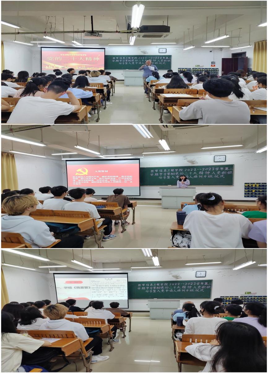 4月17日晚,医学信息工程学院分党校在黄金校区开展2022-2023学年第二学期学习贯彻党的二十大精神入党积极分子暨入党申请人培训开班仪式暨第一讲,该院党委书记唐明主讲,100余名师生入党积极分子、入党申请人参加培训。