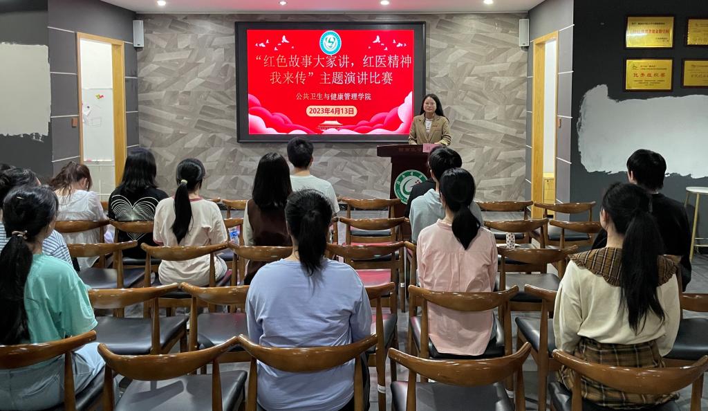 近日,公共卫生与健康管理学院在黄金校区举办“红色故事大家讲,红医精神我来传”主题演讲比赛。该院团委负责人、参赛选手及2018级学生代表参加。