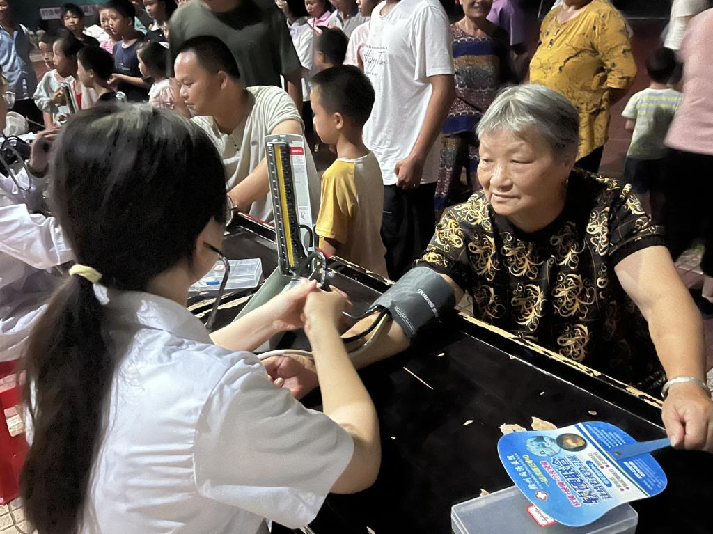 在扬眉镇体育广场,实践队为当地村民测量血压、按摩,举行科普知识竞赛与急救知识宣讲等。义诊现场热火朝天,队员们对村民进行血压测量,并根据测量结果为村民提供健康建议。在科普知识竞赛现场,小朋友们争先恐后地举手回答问题,社会实践队还为在现场的小朋友们准备了精美小奖品。