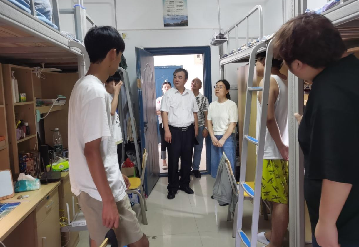 谢水祥还带领辅导员逐一走访了新生宿舍,检查水电、设备实施、安全卫生等问题,他表示,学工办要与学校宿管科、后勤保障中心及时沟通协调,充分做好新生宿舍入住前的准备工作,确保新生顺利入住,让家长放心,以安全、整洁、舒适和温馨的住宿环境迎接2023级新生。