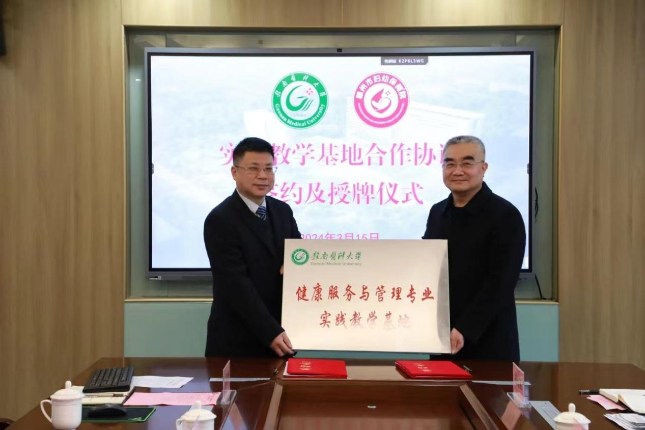 3月15日,公共卫生与健康管理学院院长黄诚带队赴赣州市妇幼保健院开展“健康服务与管理专业实践教学基地”合作签约暨“访企拓岗”促就业活动,赣州市妇幼保健院院长邓辉,市妇保院科教科、健康管理中心等科室负责人及公共卫生与健康管理学院教师代表参加活动。