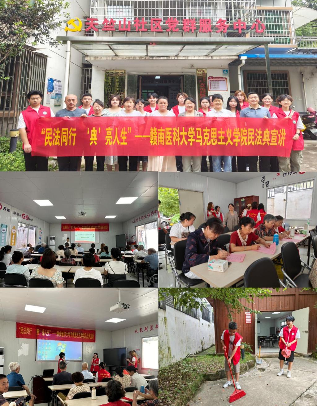 2024年5月是我国第四个“民法典宣传月”。为深入学习宣传民法典,切实将民法典推进到群众身边,5月28日上午,马克思主义学院“德法双育”志愿者服务队在学院党委副书记毛磊焱的带领下前往赣州市天竺山社区开展民法典宣讲活动。