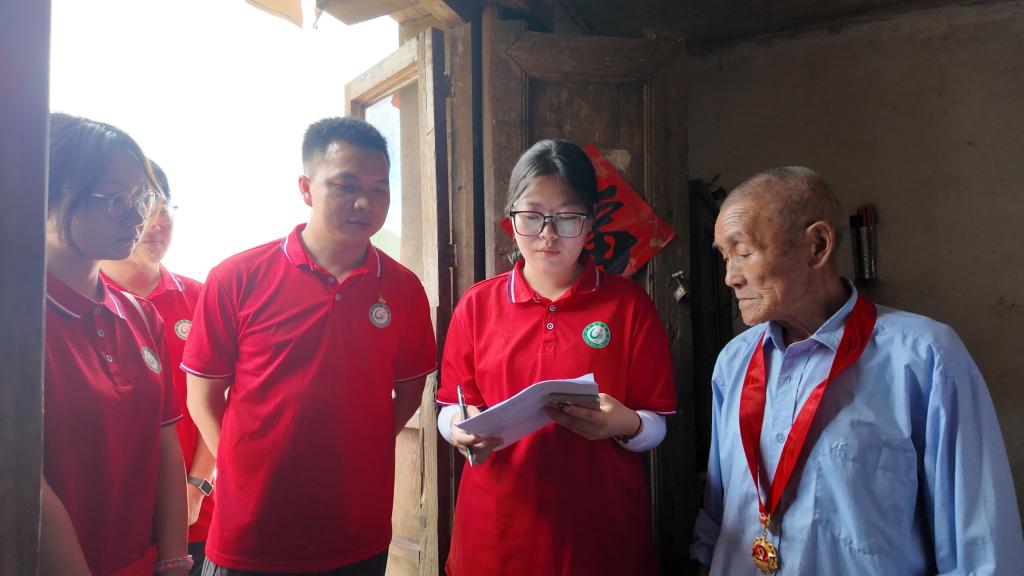 聆听初心故事,厚植家国情怀。“入了党就要为人民服务一辈子,不求回报。”这是崇义县上堡乡均源村有55年党龄的87岁老党员廖聪福经常挂在嘴边的话。实践队员在村干部带领下,来到廖聪福家中开展慰问访谈,聆听他入党以来的心路历程,深刻感受信仰的力量。当谈到村子近些年的变化时,廖聪福感慨地说:“这几十年,我们生活的各个方面都发生了翻天覆地的变化,共产党让我们老百姓过上了好日子,身为一名共产党员非常光荣也非常感恩。”访谈最后,廖爷爷表达了对青年一代的殷切期盼:“年轻人要始终听党话,永远跟党走,努力学习,练好本领,乐于奉献。”这份谆谆嘱托,激励着实践队员们要勇挑重担,奋勇争先,努力成长为有理想、敢担当、能吃苦、肯奋斗的新时代好青年。