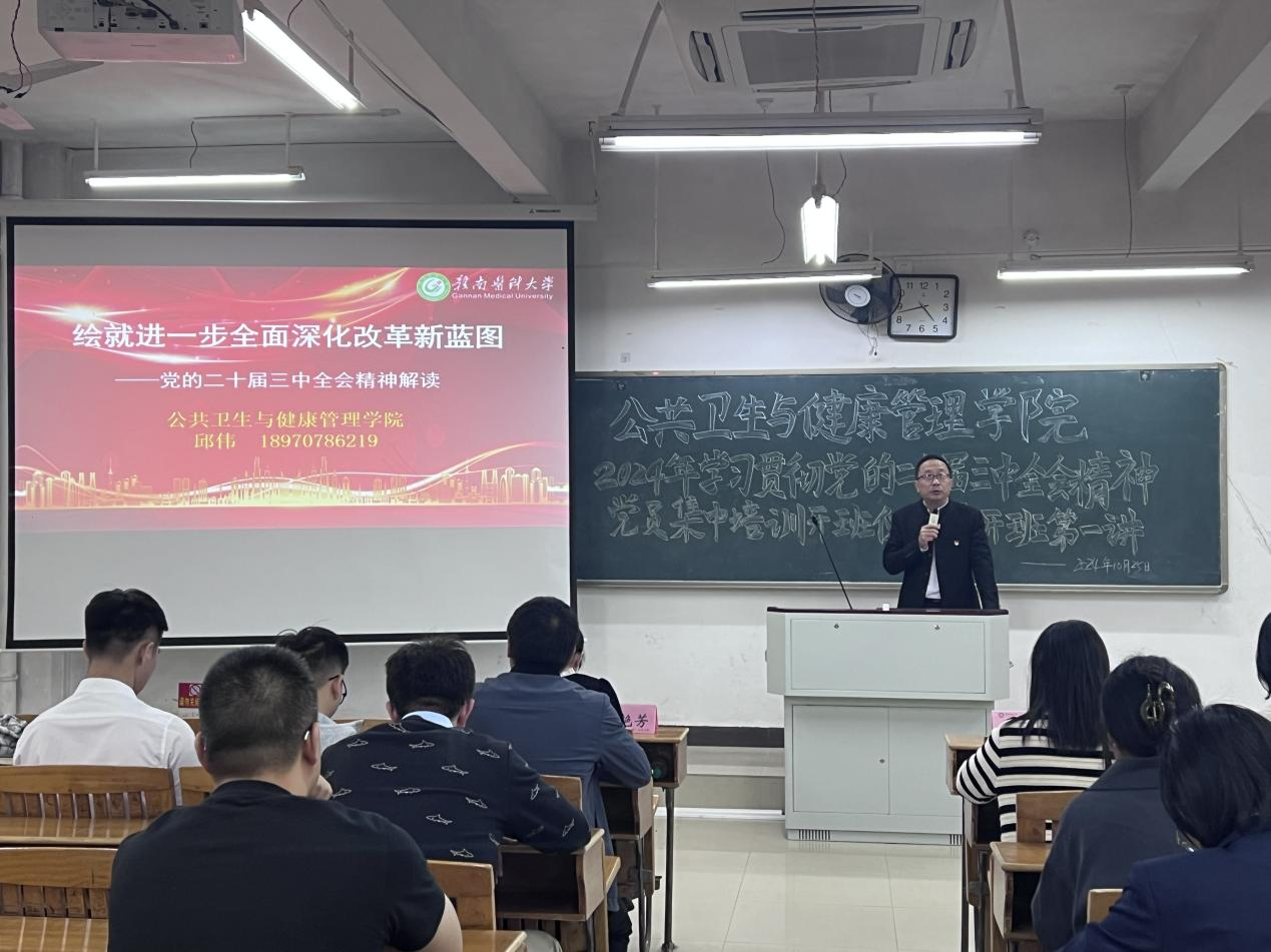 10月25日,公共卫生与健康管理学院举行2024年学习贯彻党的二十届三中全会精神党员集中培训班开班仪式暨培训第一讲。学院党委书记邱伟同志作开班致辞,学院党委委员、副院长高艳芳主持会议,学院党政领导班子成员、全体党员参加。