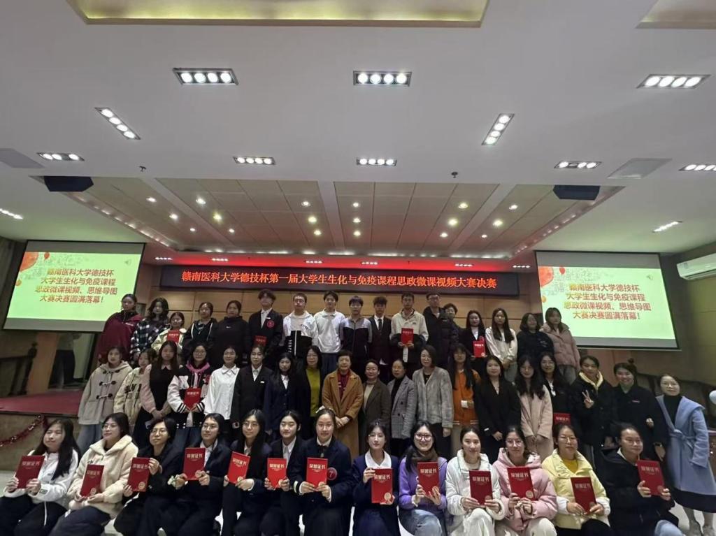 12月7日,由教务处和基础医学院共同主办,生物化学与分子生物学教研室、医学免疫教研室、生化免疫研学会共同承办的赣南医科大学“德技杯”第一届生化与免疫课程思政微课视频大赛决赛在黄金校区圆满落幕。此次大赛旨在深入挖掘生化与免疫课程中的思政元素,提升课程思政教学质量,促进专业教育与思政教育的有机融合。