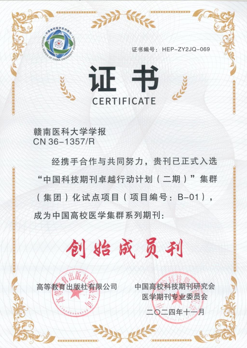 《赣南医科大学学报》将以此为契机,围绕“中国科技期刊卓越行动计划”的核心目标,充分利用“集群化试点项目”这一重要平台,通过深化合作、资源共享,积极探索创新发展新模式,提高期刊学术质量,加强学术传播力度,提升学术影响力,更好地服务于我校学科建设、医学发展和人才培养。为支持学校高质量发展三年行动计划和博士学位授予单位的申报,建设特色鲜明、区域一流、国内知名的高水平医科大学贡献智慧和力量。