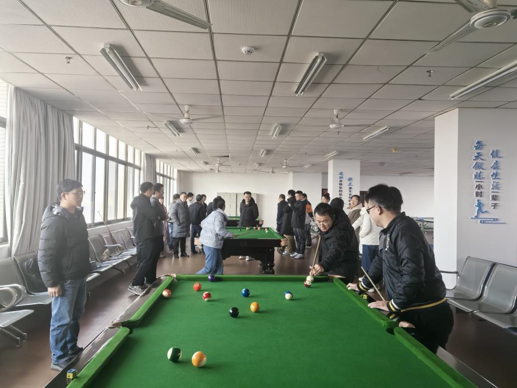 台球场上,教职工们全神贯注、眼神坚定,精准有力地将球击入袋,并巧妙走位,为每一杠做好准备,展现了选手们的专注与智慧。