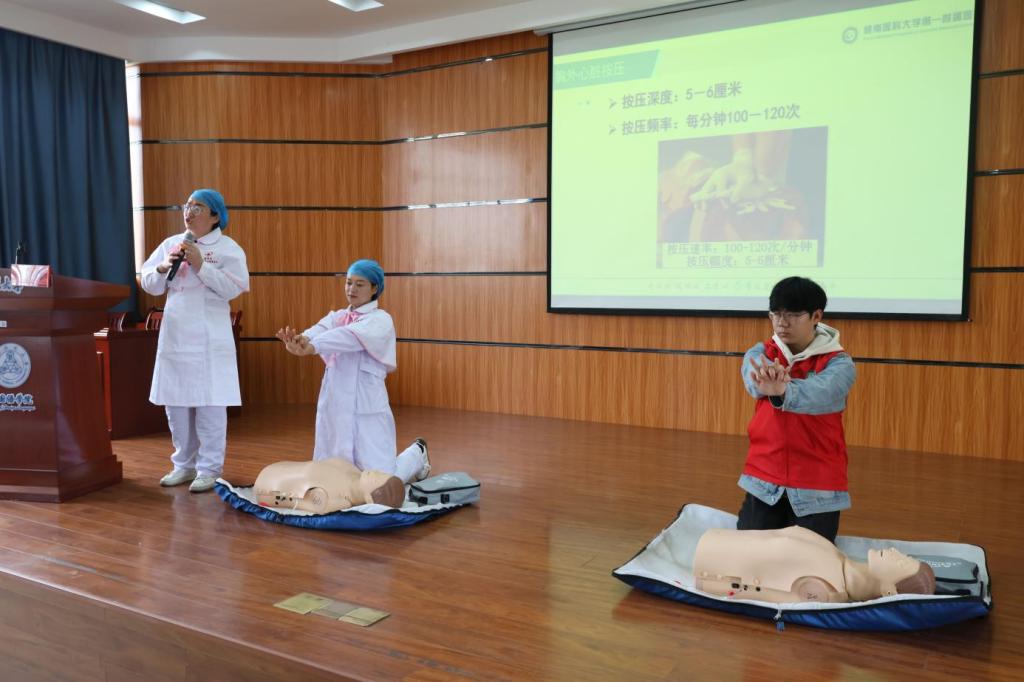 活动现场,第一附属医院急诊科医护人员通过理论讲解与情景模拟,生动演示了成人心肺复苏的标准流程、止血包扎技巧,并针对成人与儿童的生理差异,细致解析了海姆立克急救法的操作要领。经过专业考核的志愿者们作为“急救导师”,一对一指导师生进行实操演练,及时纠正动作细节,确保操作规范。师生热情高涨,纷纷上台体验,现场互动热烈。