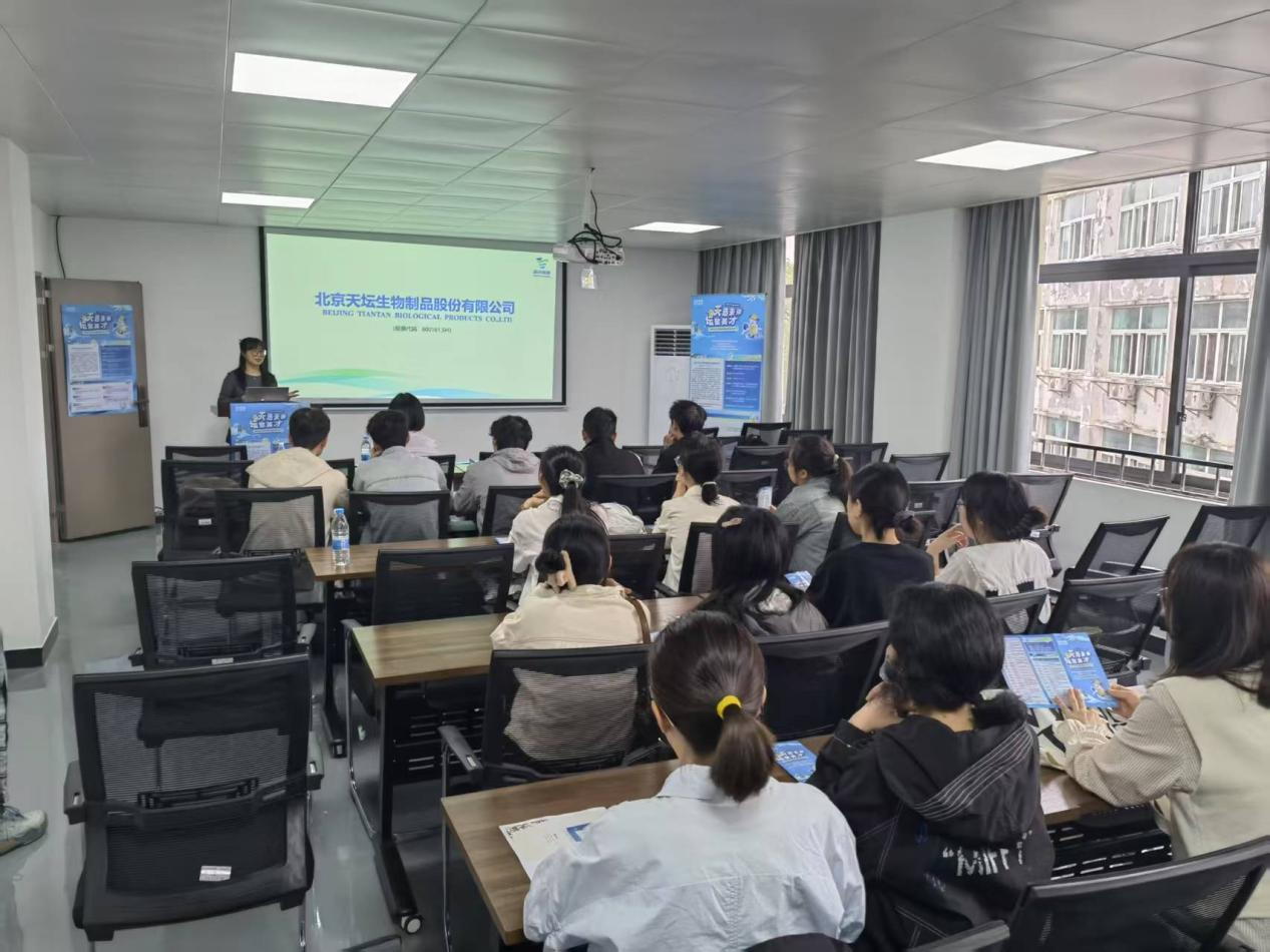 招聘宣讲会现场,北京天坛生物制品股份有限公司和江西迪安华星医学检验实验室有限公司的人事经理通过播放宣传片和PPT展示等方式,向同学们介绍了企业发展史、企业文化、岗位要求、晋升通道、薪资待遇,并与在场的学生进行互动,就大家关心的问题展开了细致的沟通与交流。宣讲会现场气氛融洽热烈,共有三十余名同学现场投递简历,多名同学与企业签订就业合同。