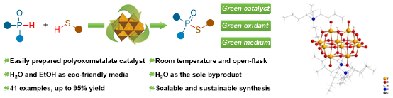 研究团队开发了一种基于多酸(POM)催化的P(O)−H/S−H交叉脱氢偶联新策略。该方法创新性地采用十钒酸阴离子作为催化剂,以空气为氧化剂,在水或乙醇等绿色介质中,于室温条件下成功实现了硫酚/醇与P(O)−H化合物的高效偶联。整个反应过程无需依赖热、光、电等外部能量输入,也不涉及任何有害化学助剂的使用,且在克级规模合成中还表现出优异的可循环使用性充分体现了绿色化学的原子经济性和环境友好性特征。