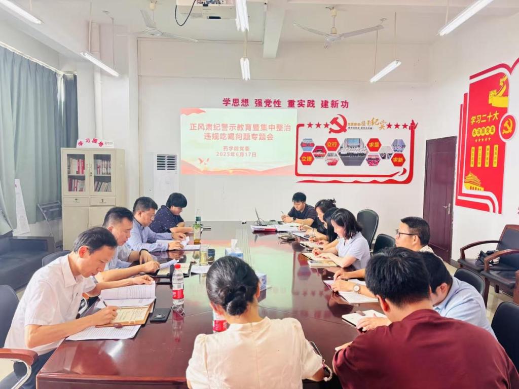 6月17日,药学院在黄金校区召开正风肃纪警示教育暨集中整治违规吃喝问题专题会。该院领导班子成员、科级干部、各党支部书记参加,会议由党委书记彭磊主持。