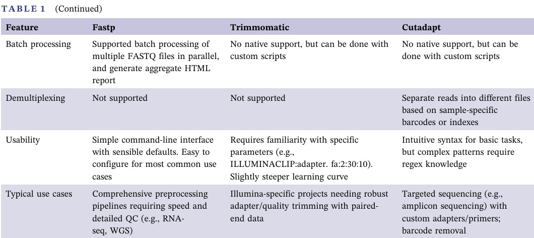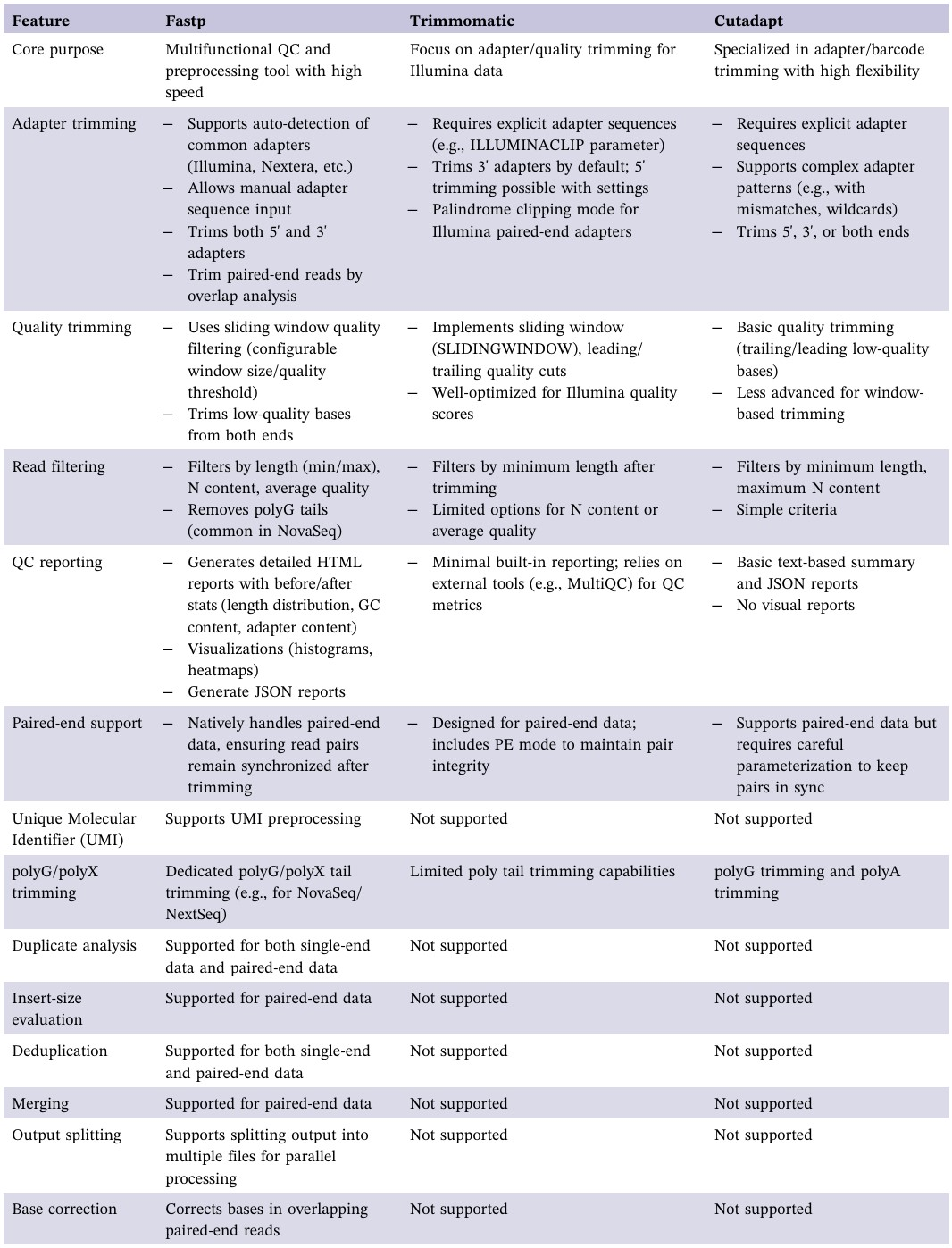 表1. fastp、Trimmomatic 与 Cutadapt 功能对比