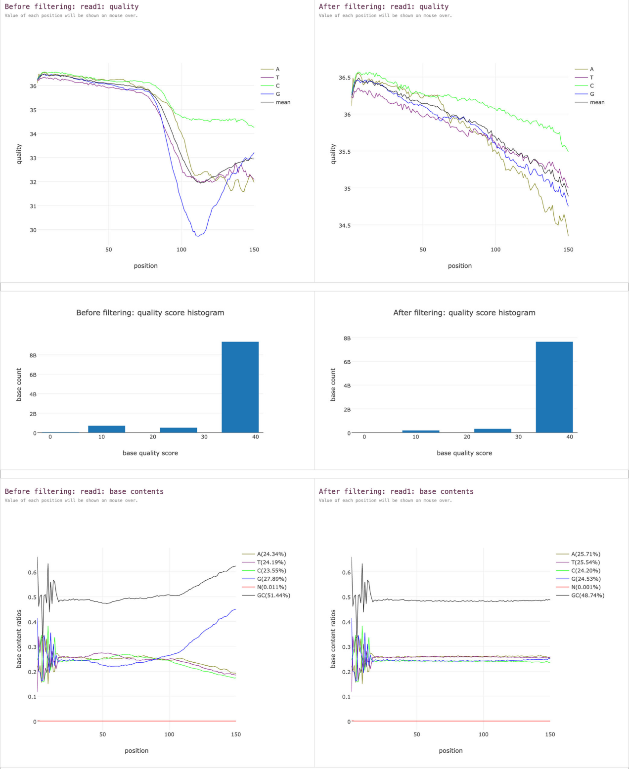 fastp 简洁性的另一个体现是其 HTML 报告。与纯文本或 CSV 报告相比,HTML 显然更加用户友好,尤其适合云端环境。在 fastp 1.0 中,HTML 报告的最大改进是提供了预处理前后数据的并排对比。