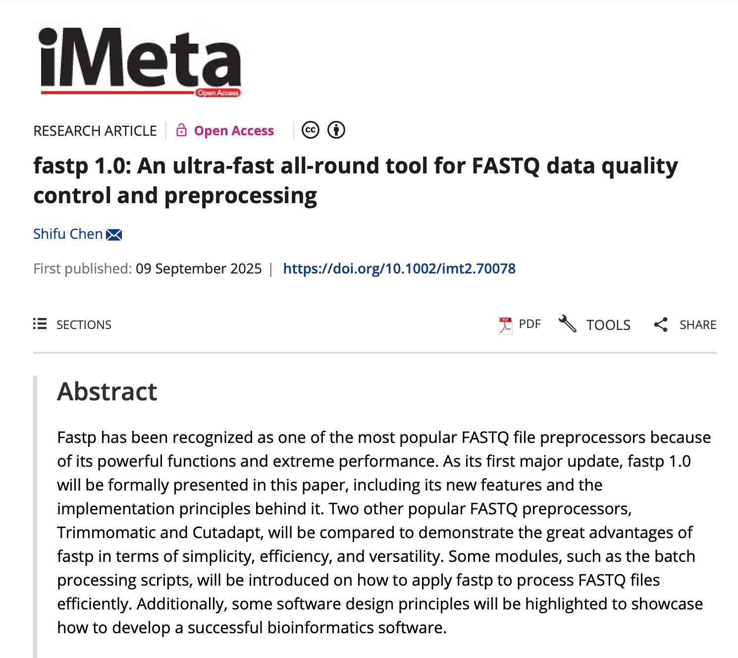 2025年9月9日,我校特聘教授陈实富博士,在iMeta(中科院1区,IF=33.2),以独立作者发表高性能生物信息学软件fastp1.0(我校为第一单位)。该生物信息学软件因其强大的功能和极致的性能而被公认为最受欢迎的 FASTQ 文件预处理工具之一,已经被引用了2万多次。作为其首次重大更新,本文正式介绍 fastp 1.0 的新功能及其背后的实现原理。为了展示fastp在简洁性、高效性和多功能性方面的巨大优势。