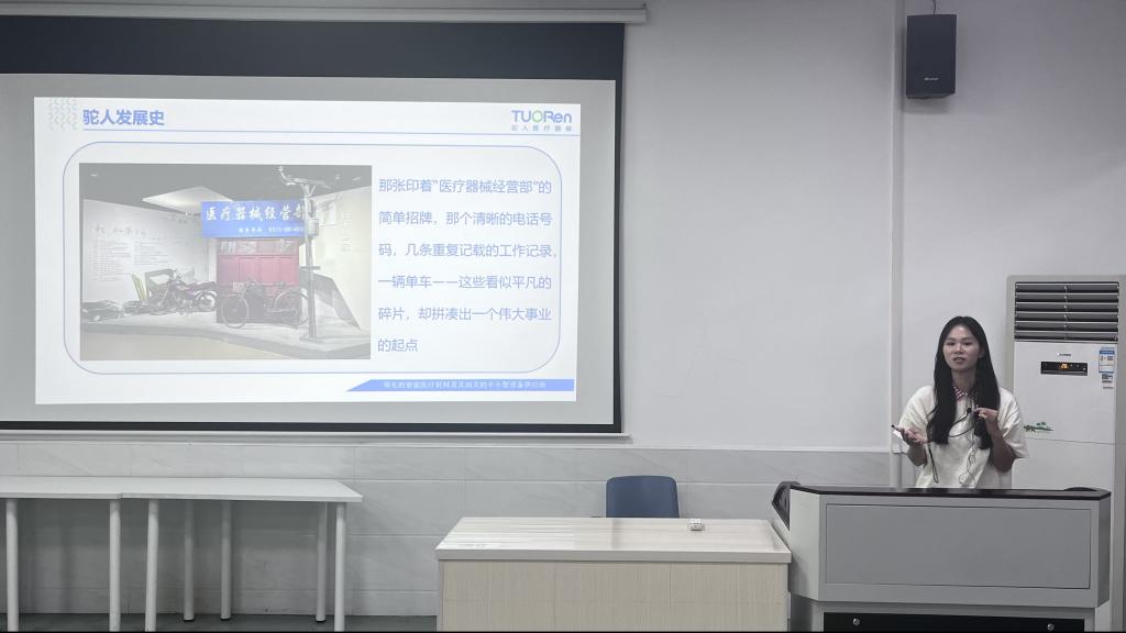南丁格尔科创小组暑期实践活动小组袁婷以《驼人实习之旅:经验与成长分享》为题,从理论到实践、从认知到深化,从行业政策解读到专利转化逻辑,从企业研发战略到临床需求分析进行分享。她表示,暑期实践不仅促进了个人成长、明确了职业方向,也促使她立志突破行业壁垒,与行业共进、与时代同行。
