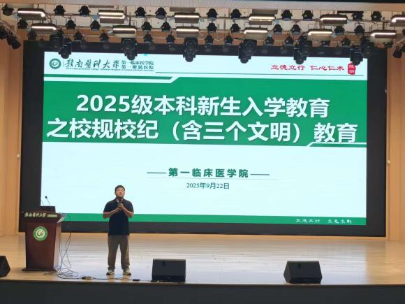 为帮助2025级新生适应大学环境、明确学习目标、筑牢职业素养根基,近日,第一临床医学院在龙南校区开展2025级新生入学教育。本次教育覆盖临床医学、儿科学、麻醉学、医学影像学四大专业760余名新生。