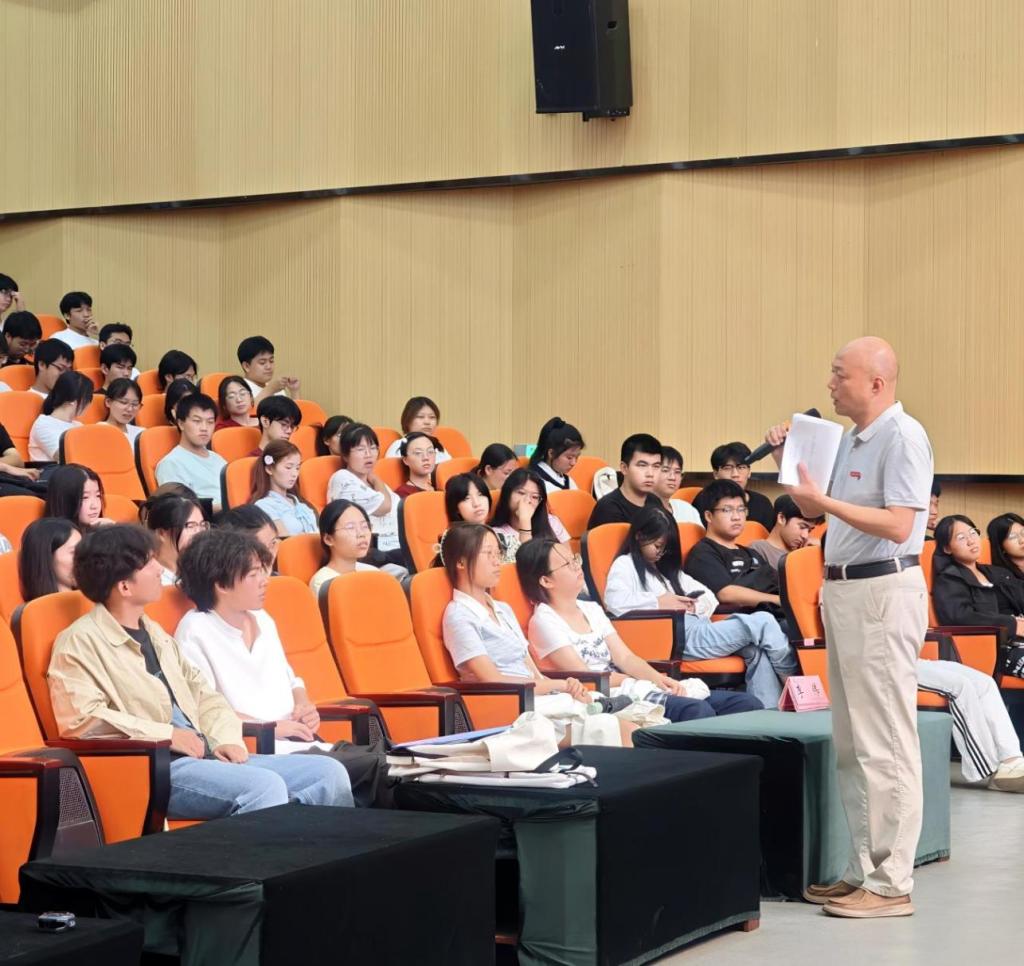 唐明以“初入大学的感悟与思考”为切入点,结合习近平总书记对青年“增强做中国人的志气、骨气、底气”的殷切嘱托,用鲜活案例与深厚理论,分三个维度为新生深刻阐释新时代青年的使命担当。谈及“立大志,铸牢做中国人的志气”,他鼓励新生在大学阶段确立人生梦想,将“小我”融入祖国“大我”、人民“大我”——从“五四运动”中20余岁的李大钊、毛泽东为民族复兴奔走,到钱学森、邓稼先归国报国的赤子心,他以先辈事迹叮嘱新生:“志向不是空想,要分解为每一个阶段性目标,让青春航向始终与时代同频。”讲到“强骨气,涵养做中国人的气节”,唐明引导新生“补足精神之钙”:从吉鸿昌胸前“我是中国人”的木牌彰显民族尊严,到“两弹一星”精神背后科研工作者攻坚克难的坚守,他强调“骨气是面对挫折不退缩,是主动融入国家发展规划,在时代洪流中找到人生坐标,让‘中国精神’成为前行的底气”。谈及“练本领,夯实做中国人的底气”,他激励新生践行“自信人生五百年”的豪情:“底气源于实力,大学是练就过硬本领的黄金期。”他以张雨霏泳池逐梦、叶聪深耕深海科技等青年榜样为例,叮嘱新生“以‘拼命学习’的劲头提升综合素质,把专业知识学扎实、把实践能力练过硬,让实力成为应对未来挑战的最大底气”。