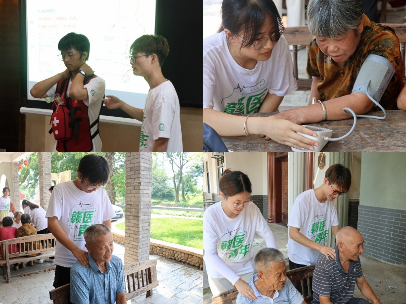 实践队积极响应 “万名大学生进千站” 文明实践志愿服务专项行动,以新时代文明实践站为阵地,在龙南市文化社区、叶坪镇朱坊村、沙洲坝村等地,与各村新时代文明实践站开展长期合作,共同设立 “急救站”,捐赠内含止血带、碘伏棉签、医用纱布等专业急救物品的急救包,为突发情况提供及时保障。队员们化身 “急救先锋”,通过互动教学、情景模拟等方式,手把手指导村民学习海姆立克急救法,还为村民测量血压、发放健康手册,围绕高血压、糖尿病等常见慢性病开展科普宣讲,收获了村民的广泛好评。