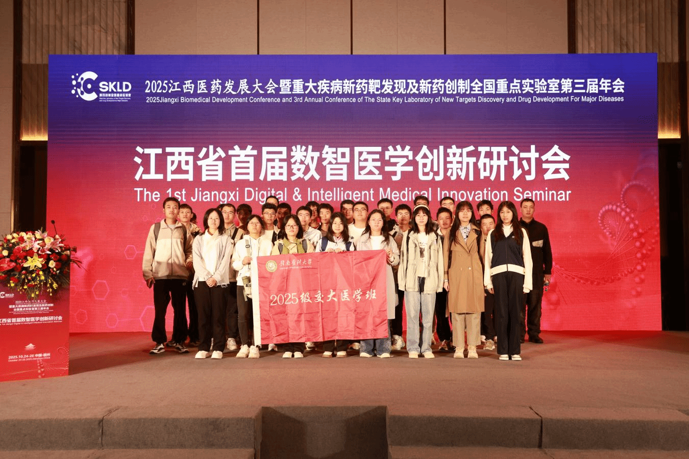 10月24日至26日,2025江西医药发展大会暨重大疾病新药靶发现及新药创制全国重点实验室第三届年会在江西赣州召开,江西省首届数智医学创新研讨会作为大会的重要组成部分举行。我校2025级交大医学班全体学生参会,积极融入医药创新前沿,展现了该班在医学教育与科研融合中的积极探索精神。
