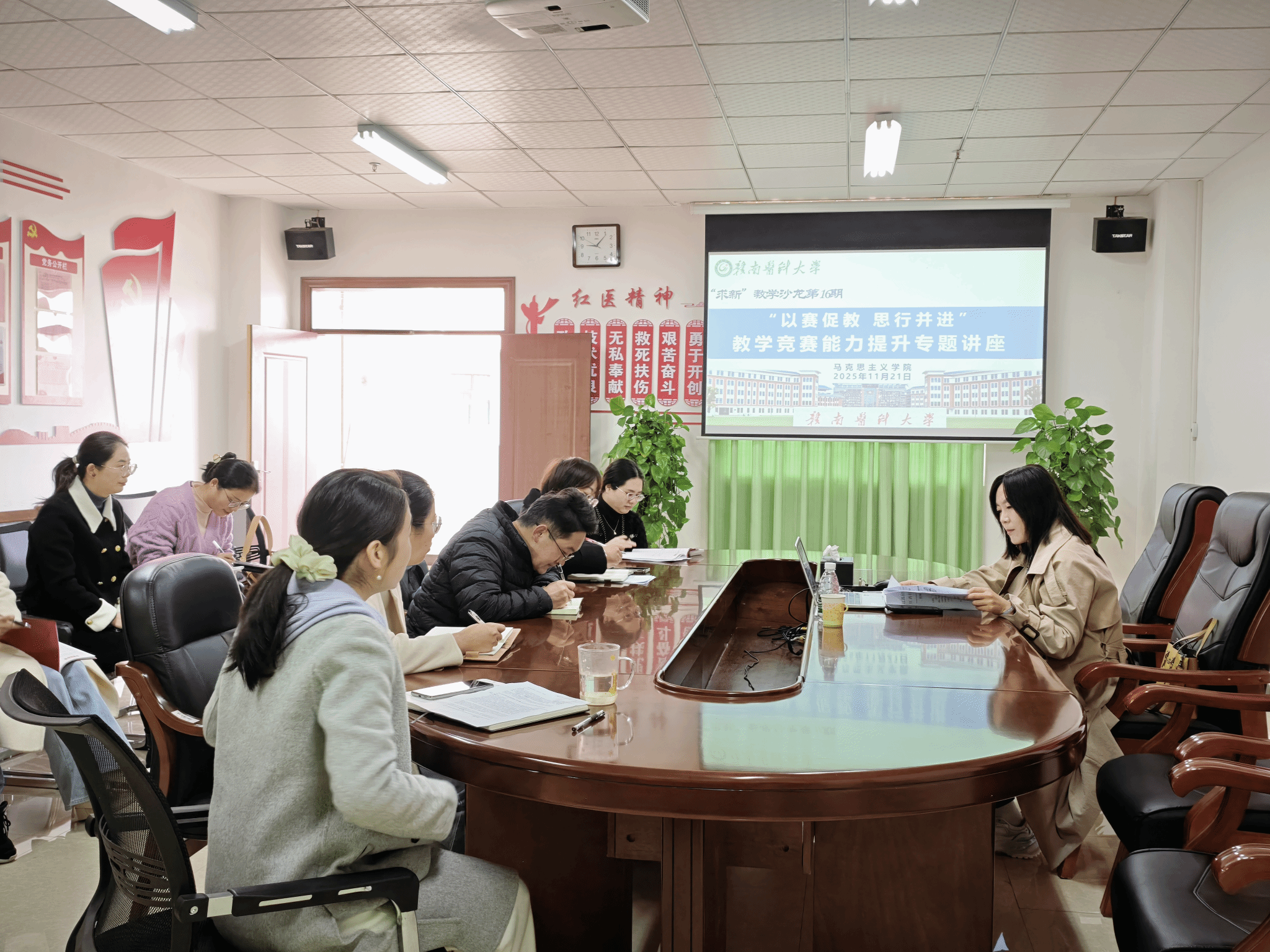 11月21日,马克思主义学院举办“求新”教学沙龙第16期暨教师教学竞赛能力提升专题讲座。讲座特邀大理大学陈旭教授主讲,陈教授曾在第三届全国高校思想政治理论课教学展示活动中荣获“特等奖”。讲座以“以赛促教,思行并进”为主题,围绕新时代高校思政课教师必备素质、教学能力提升路径及教育部教学展示参赛经验展开深入分享。