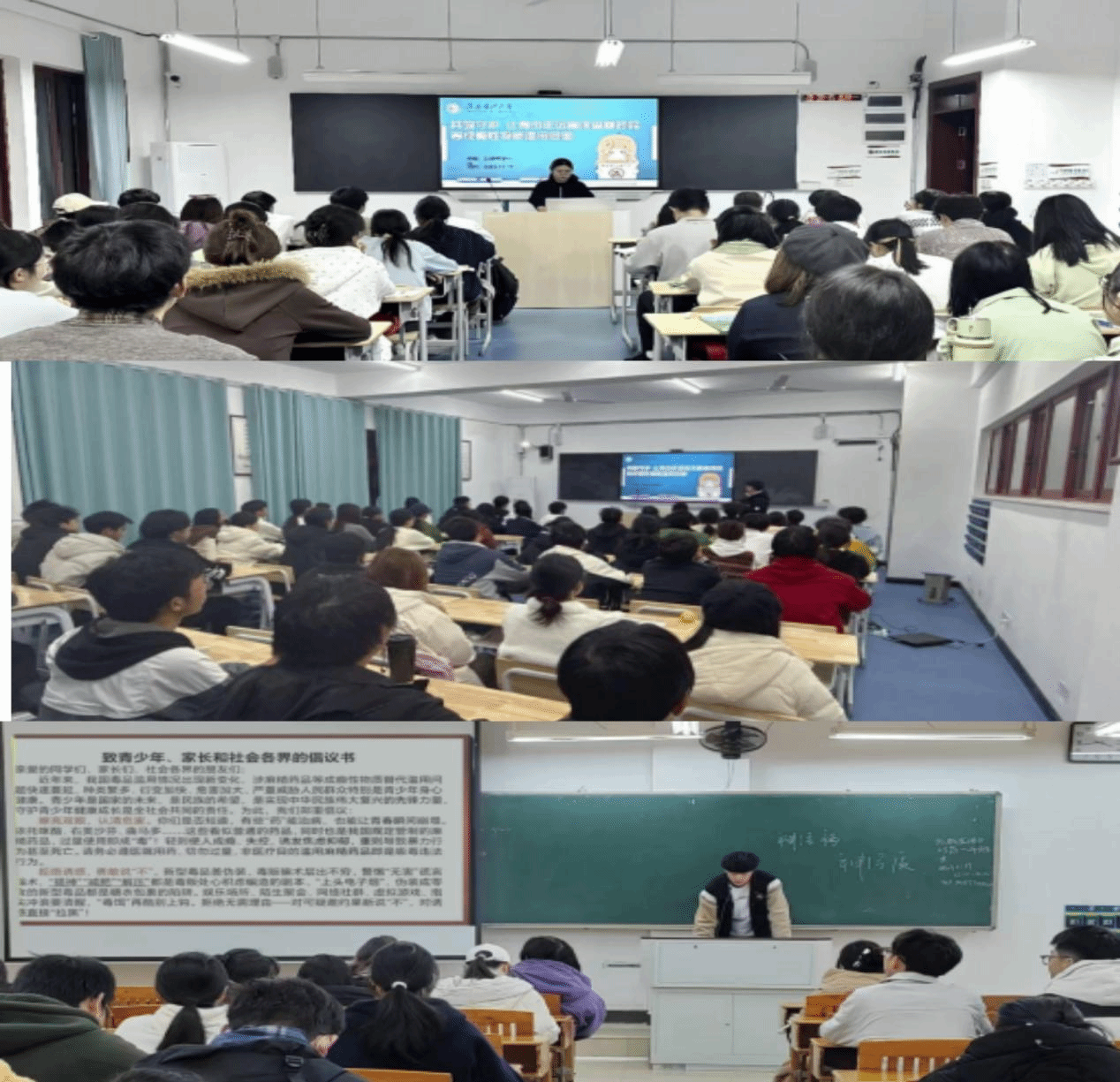 在成瘾性物质滥用防范主题宣教环节,各班级深度融合 “红药匠”精神中“精研药术、服务健康、守护生命”的核心要义,开展多维度警示教育。班主任与学生骨干通过剖析涉麻精药品的成瘾性与危害性、展示典型滥用案例、解读相关法律法规等方式,为全体学生敲响安全警钟。