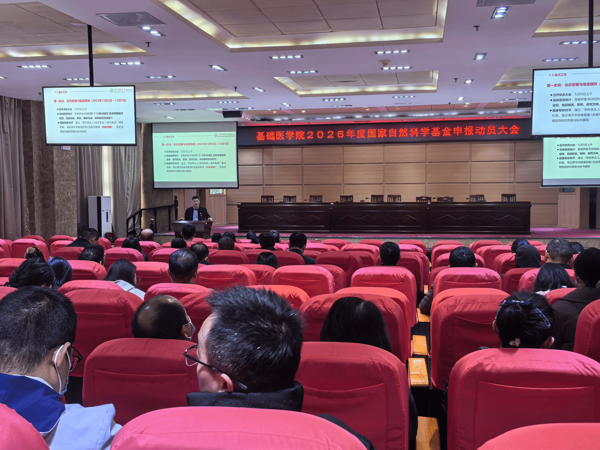 为扎实推进2026年国家自然科学基金项目申报工作,充分调动学院教师申报积极性,提升项目申报质量与成功率,12月5日上午,基础医学院在蓉江校区召开国家自然科学基金申报动员大会。学院党委书记陈联娇,副院长谢富华、陈鑫出席会议,全院无教学任务的教师参加会议。会议由谢富华主持。