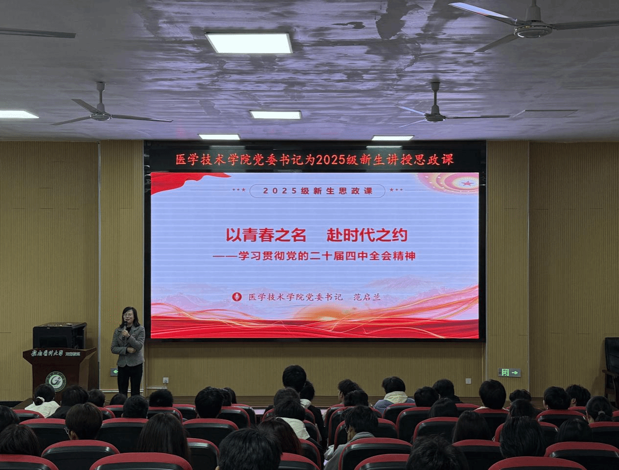 为深入学习贯彻党的二十届四中全会精神,引导学院2025级新生将个人理想融入国家发展大局,12月4日下午,医学技术学院党委书记范启兰在龙南校区为2025级120名本科新生讲授了一堂主题鲜明、内涵深刻的思政课。
