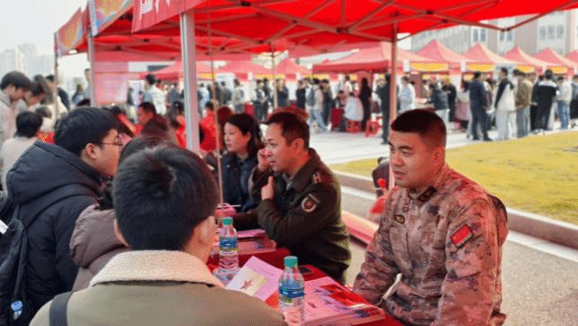 12月23日,在蓉江校区校园“双选会”现场,赣州市军分区、章贡区人民武装部、学校人民武装部征兵工作站在现场设立宣传咨询站,开展征兵政策宣传活动。在征兵咨询点,工作人员围绕2026年征兵对象、基本条件、报名流程、体检政考要求、优待政策以及退役复学、就业扶持、发展前途等方面进行了系统而详尽的讲解。学校大学生崇军协会志愿者,深入现场向大学生发放征兵宣传单,讲解征兵相关政策,引导大学生到咨询点听取政策解答。