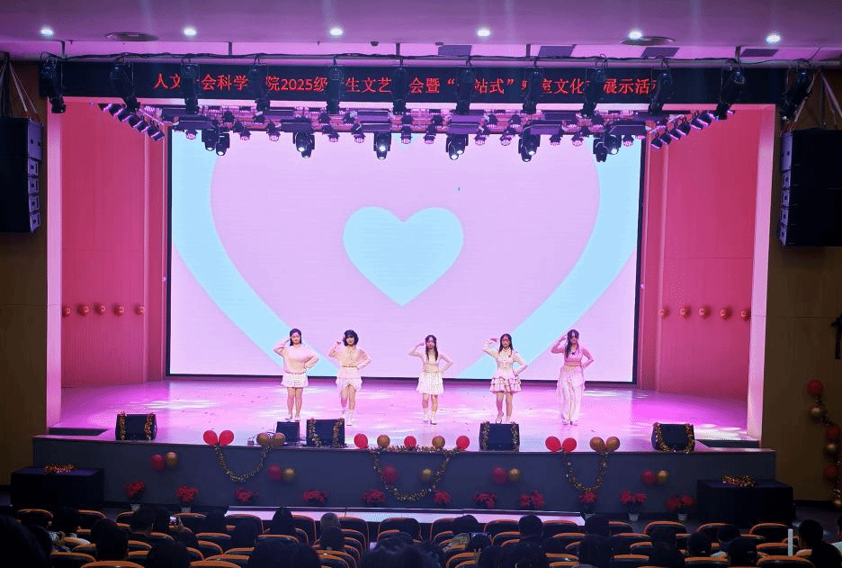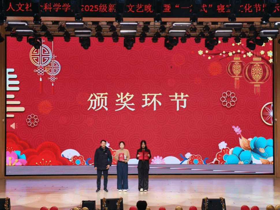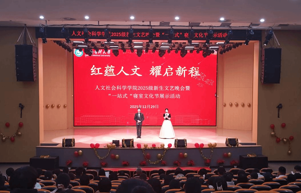 为丰富校园文化生活,展现新生风采,推进“一站式”学生社区建设,12月29日晚,人文社会科学学院在龙南校区举办“红蕴人文耀启新程”新生文艺晚会暨“一站式”学生社区寝室文化节展示活动。学院党政领导、学工办辅导员和2025级全体学生共同参与本次活动。