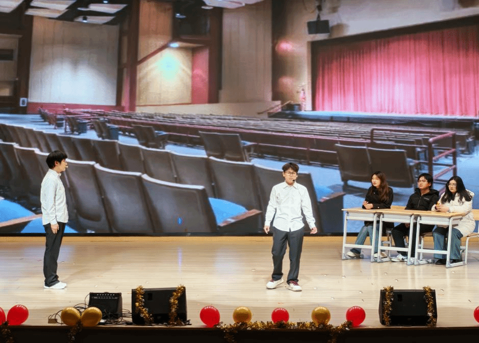 晚会节目形式多样、内容丰富多彩,涵盖舞蹈、歌曲、朗诵、情景剧、器乐演奏等多种表演形式,全方位展现了人文学子的艺术素养与精神风貌。活力四射的开场舞以明快的节奏拉开晚会序幕,瞬间点燃全场热情;情景朗诵《成为那束光》结合学院“红蕴人文”党建品牌特色,回溯红医历史、诠释初心使命,引发全场师生强烈共鸣;激情澎湃的架子鼓独奏、诙谐生动的校园情景剧《模仿者》等节目轮番登场,或温情治愈,或活泼有趣,赢得台下阵阵掌声与欢呼声。