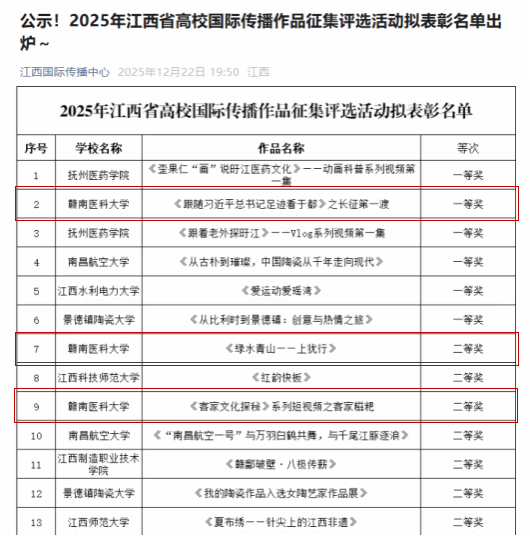 近日,经各高校自主申报、形式审查和专家评审,2025年全省教育系统国际传播作品征集评选结果揭晓,其中我校选送的作品《跟着习近平总书记足迹看于都》之长征第一渡(团队成员:钟富有、丁骏波、林常贵等)获一等奖,《绿水青山——上犹行》(团队成员:钟富有、林常贵、丁骏波等)、《客家文化探秘》系列短视频之客家糍粑(团队成员:钟富有、张琳、林常贵等)分别获二等奖。
