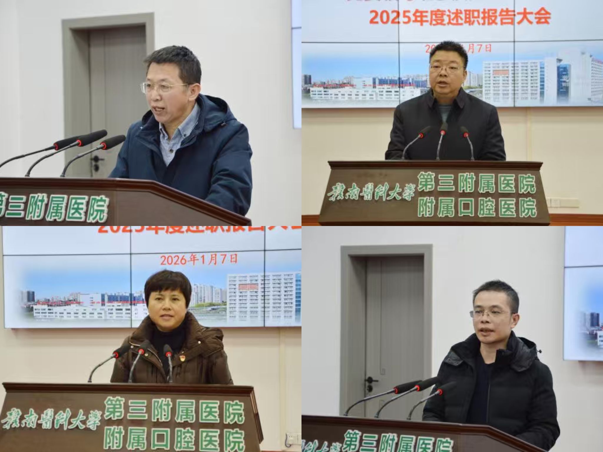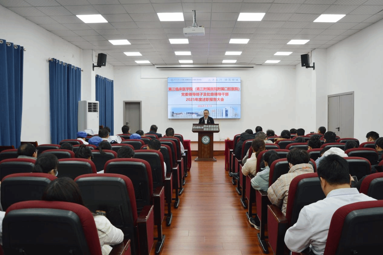 1月7日,第三临床医学院(第三附属医院、附属口腔医院)召开2025年度党委领导班子及处级领导干部述职报告大会。会议由该院党委书记林金秤主持,学校测评组到会指导。医院领导班子成员、中层干部、副高及以上专业技术职称人员及职工代表70余人参会。