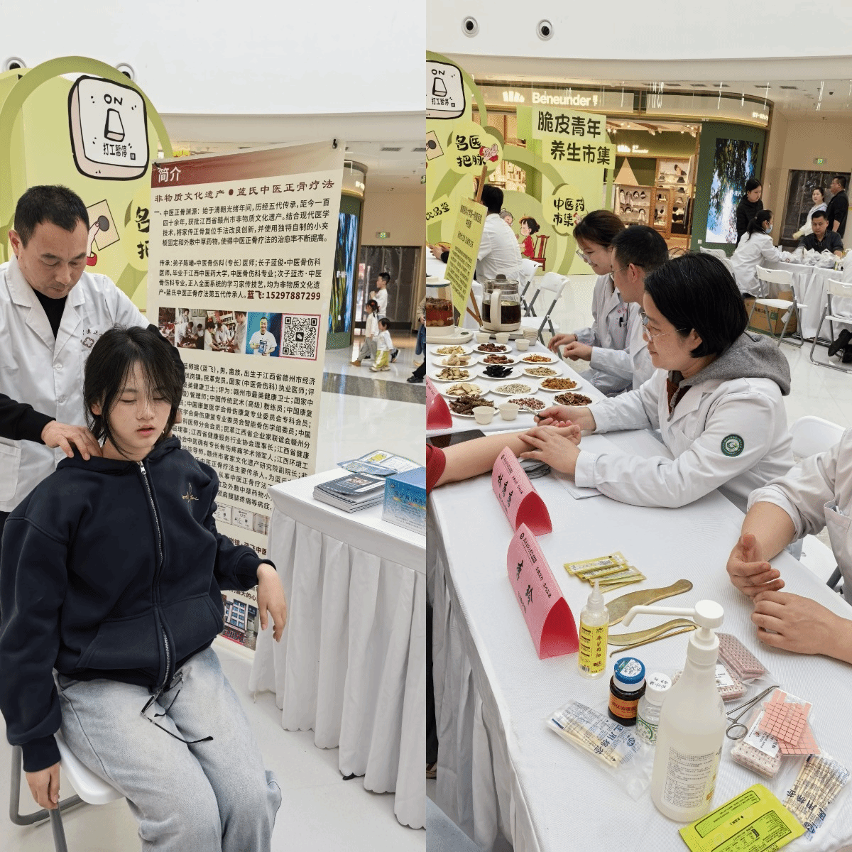 活动中,赣州市名中医、民革赣南医科大学支部党员林唐唐现场演示耳穴压豆疗法,针对多梦、慢性焦虑、假性近视、耳鸣、颈椎病、过敏性鼻炎等常见症状进行调理。非物质文化遗产“蓝氏中医正骨疗法”传承人、民革赣州经开区支部党员蓝飞展示非遗正骨技艺。两位医师用通俗易懂的语言讲解中医文化的历史与优势,吸引众多市民驻足体验,现场气氛热烈。