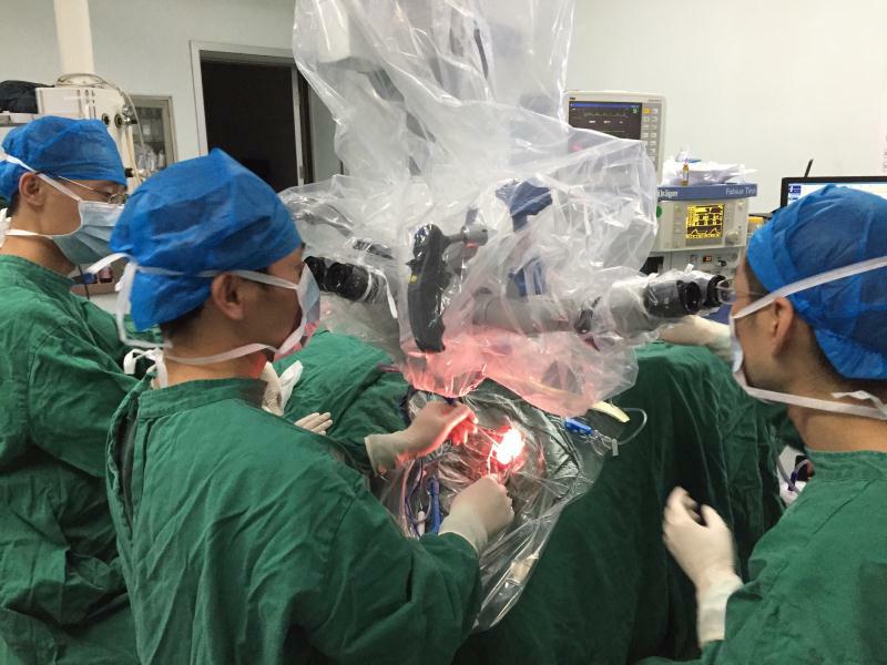 科室集体研究认为,患者既往已丧失听力及面神经已受累,适合采取迷路入路来进行手术。经精心准备,科副主任陈伟峰主刀手术,科主任彭韶平教授及北京解放军总医院申卫东教授现场指导,科副主任医师赖史胜与李继泉及麻醉科医师、护士组成的手术团队的密切配合,成功为患者实施经迷路入路桥小脑角肿瘤切除+腹部脂肪取出腔填塞术。手术用时5小时45分钟,术中肿瘤视野暴露好,止血效果显著,总出血量不到50毫升。术后30分钟患者即苏醒,安全返回病房,精神状态佳,无头痛,无呕吐,无术区出血及术区剧烈疼痛等情况。患者现已康复出院,复查情况正常。