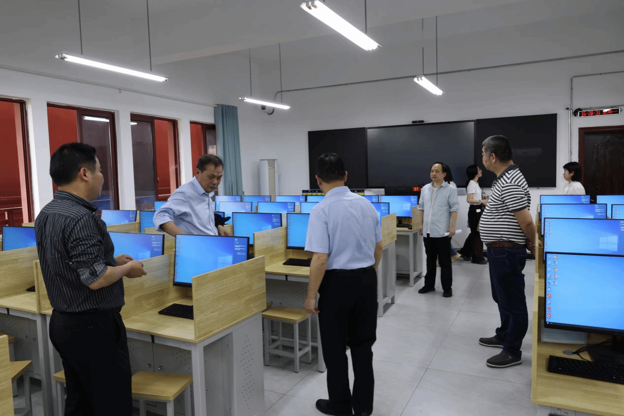 会后,专家组一行前往龙南校区第五、六实训楼,对服务器机房、考务办公室、考前培训室以及6个机房考试点进行了实地检查验收。