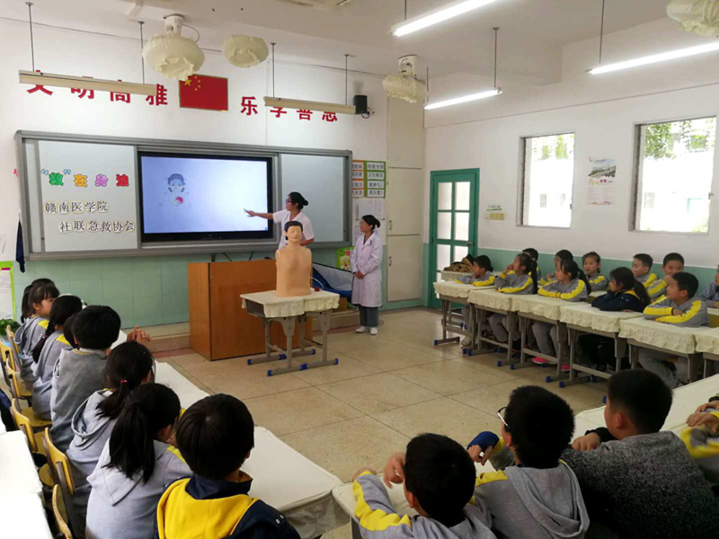 3月27日,学校社联急救协会在医学实用技能培训中心杨娟老师的带领下前往赣州市文清实验小学,在该校四年级(8)班开展心肺复苏知识与技能培训。